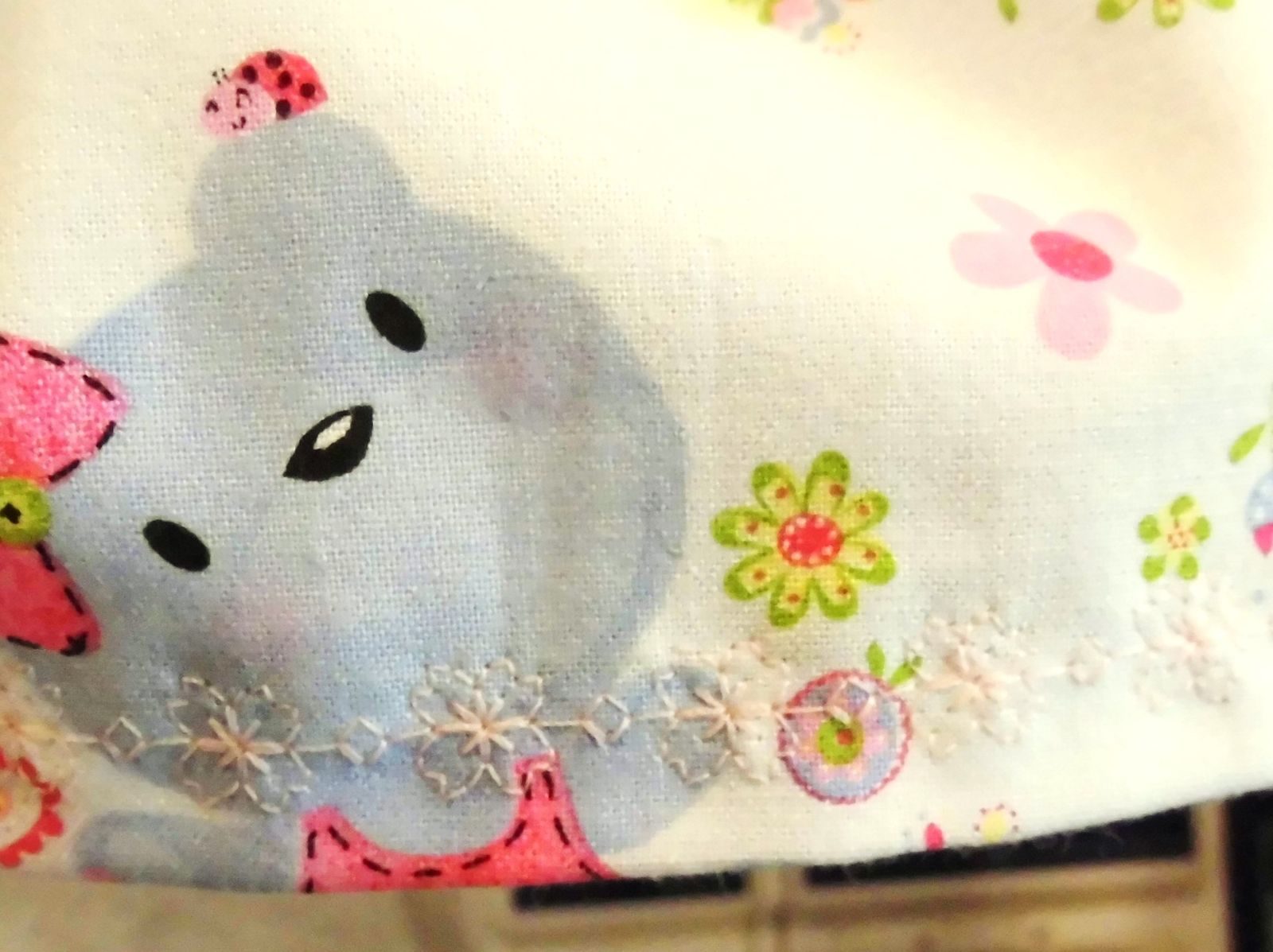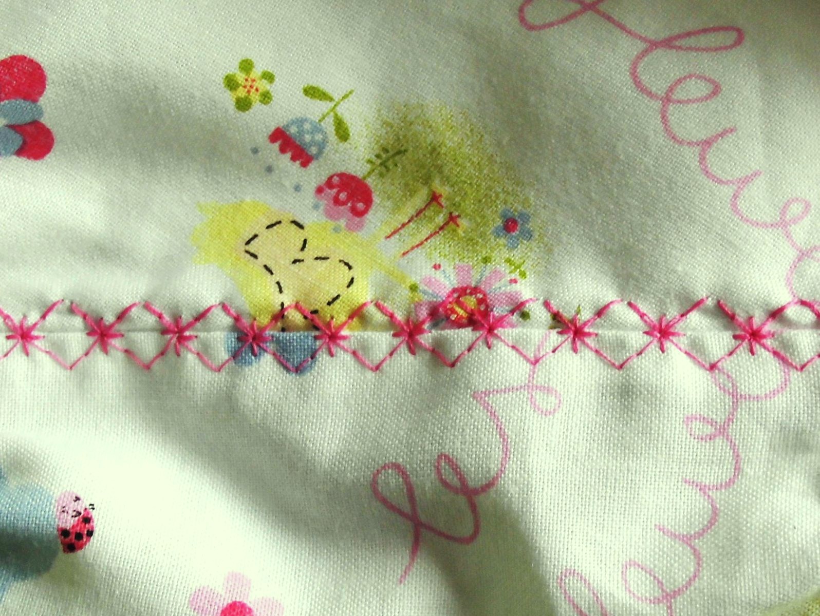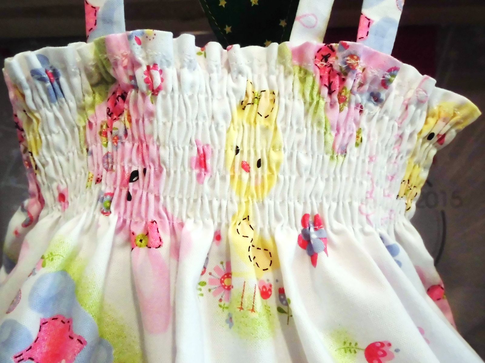 In der Oberkante sind Kräuselungen mit einem dünnen Gummigarn, das als Unterfaden der Nähmaschine benutzt wird, genäht.